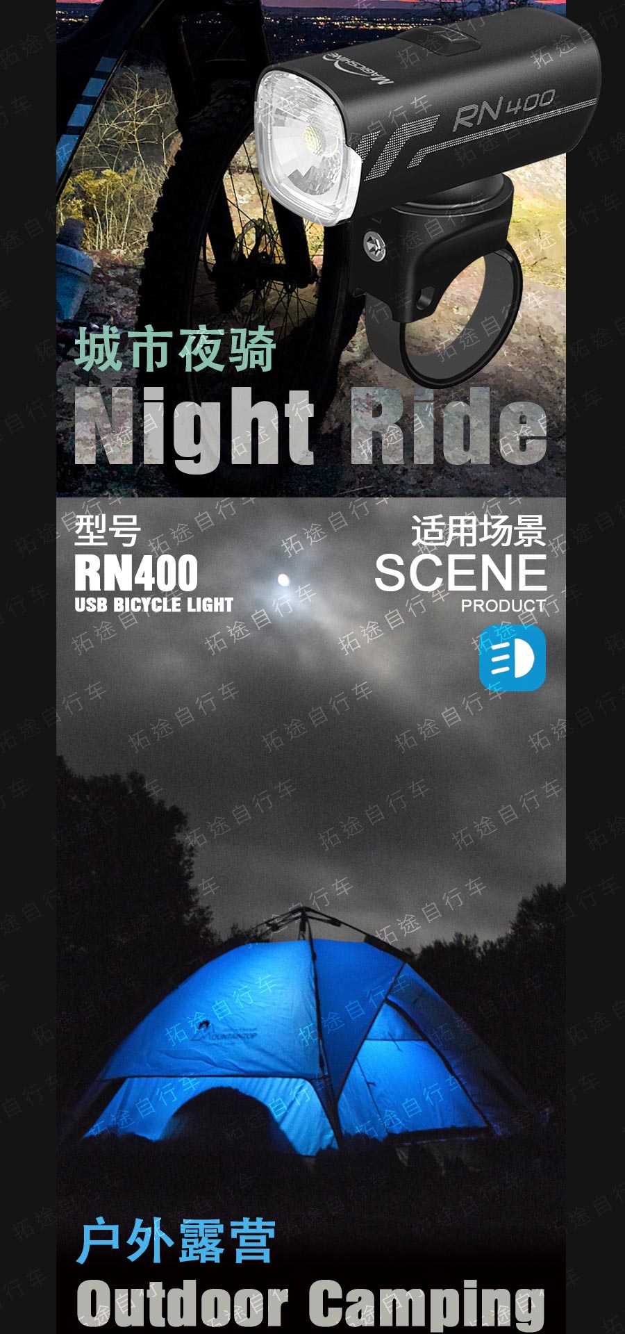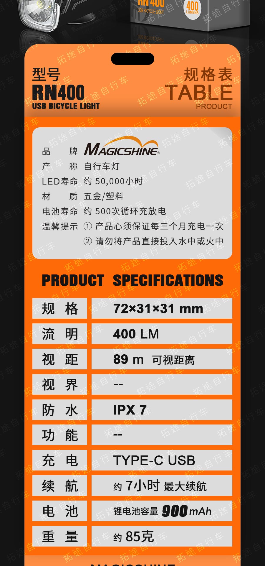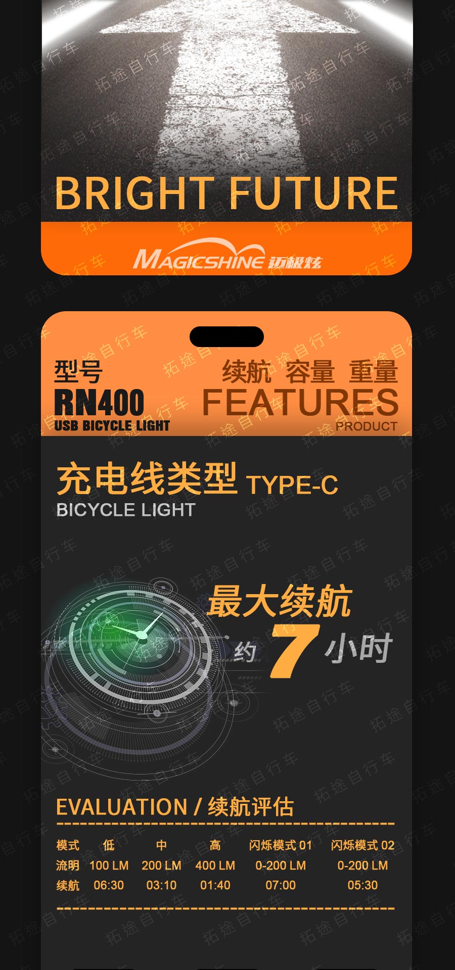 拓野车灯/CL1200/CL1600/系列自行车充电前灯