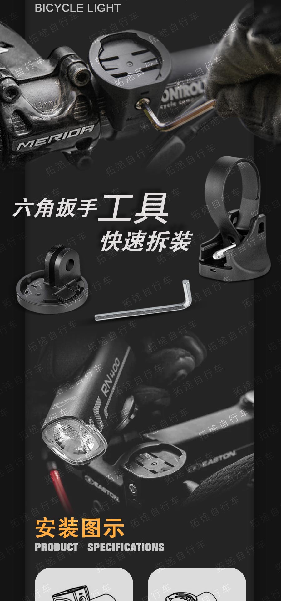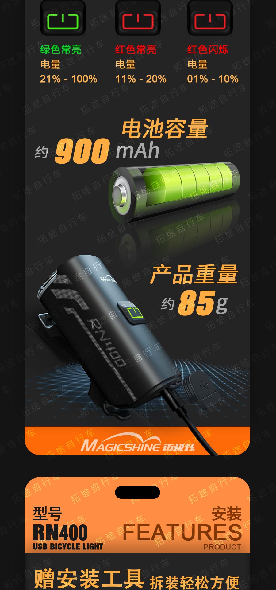 拓野/BR800/BR800S/BR1000系列充电自行车前灯/电池可拆卸