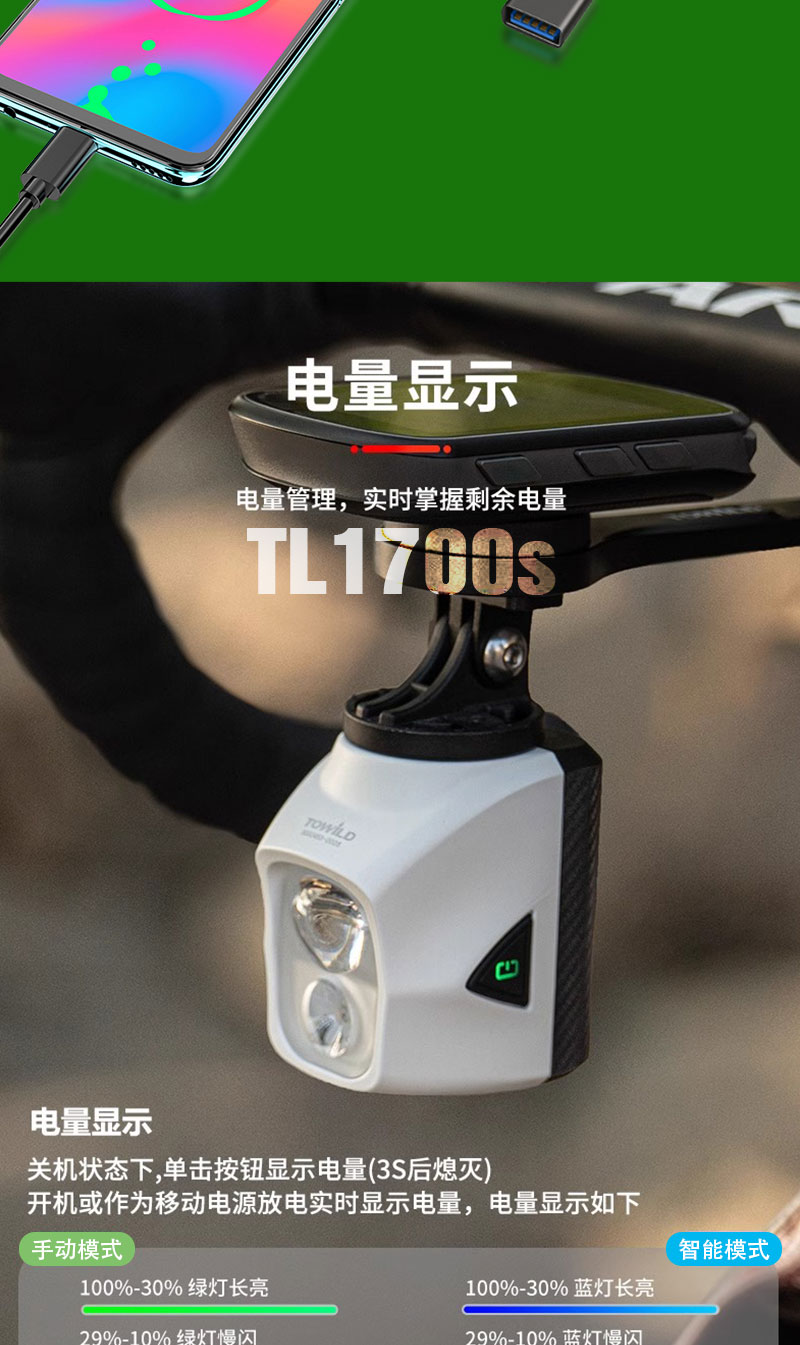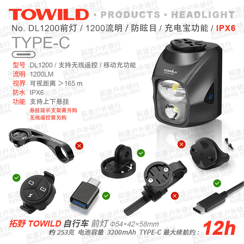 拓野车灯/CL1200/CL1600/系列自行车充电前灯